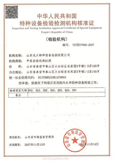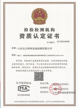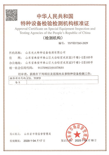 山東光大特種設(shè)備檢測有限公司是經(jīng)山東省市場監(jiān)督管理局核準(zhǔn)的甲類B1特種設(shè)備綜合檢驗機構(gòu)。2017年9月30日取得了山東省市場監(jiān)督管理局頒發(fā)的《檢驗檢測機構(gòu)資質(zhì)認定證書》。2018年2月22日取得了山東省市場監(jiān)督管理局頒發(fā)的《特種設(shè)備檢驗檢測機構(gòu)核準(zhǔn)證》(起重機械)檢驗檢測資質(zhì)。2021年11月取得山東省市場監(jiān)督管理局版發(fā)的《特種設(shè)備檢驗檢測機構(gòu)核準(zhǔn)證》(安全閥在線、離線)校驗資質(zhì)。2023年11月取得山東省市場監(jiān)督管理局頒發(fā)的甲類檢驗機構(gòu)B1《特種設(shè)備檢驗檢測機構(gòu)核準(zhǔn)證》,具有壓力容器(RD2...